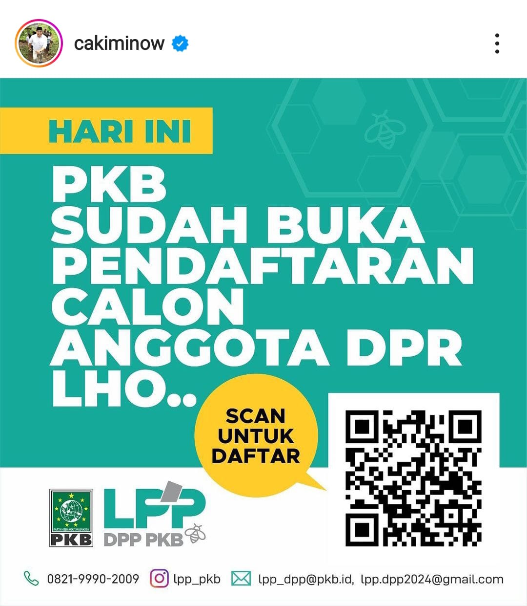 Partai Kebangkitan Bangsa membuka kesempatan khalayak untuk maju sebagai calon anggota Dewan Perwakilan Rakyat pada Pileg 2024 mendatang. Foto Instagram @Cakiminow